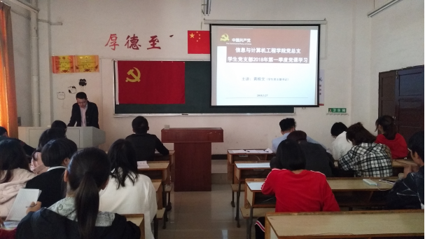 为提高我院学生党员、预备党员、入党积极分子的党性修养,积极开展我院的学生党政工作,贯彻落实“两会”精神和各项政策。2018年3月27日13时,信息与计算机工程学院学生党支部在鼎新楼2019开展了一次党课学习活动,参加本次党课的有信息与计算机工程学院全体学生党员、预备党员、入党积极分子及学生党支部干事,此次党课由信息与计算机工程学院学生党支部书记黄检文老师主讲。