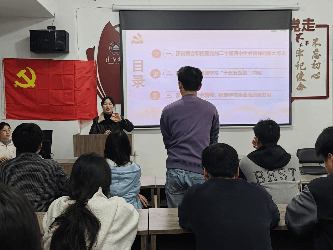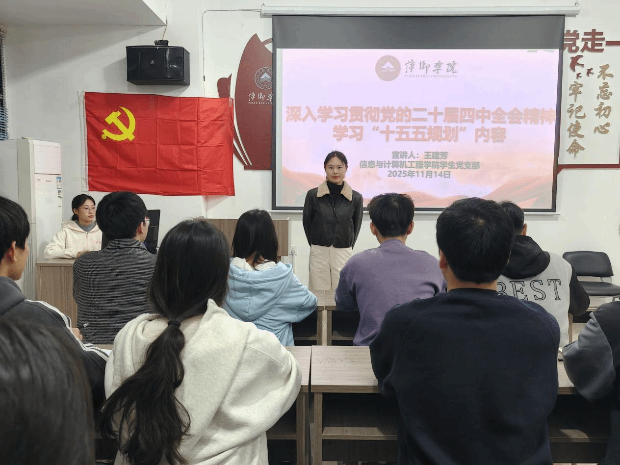 为深入学习党的二十届四中全会精神与“十五五”规划内容,助力学生党员准确把握国家发展方向与时代使命,筑牢思想根基,2025 年 11 月 14 日,信息与计算机工程学院学生党支部在18栋红管家一站式学生社区举行党的二十届四中全会精神宣讲活动,信息与计算机工程学院学生第三党支部书记王建芳主讲,全体学生党员和发展对象聆听宣讲。