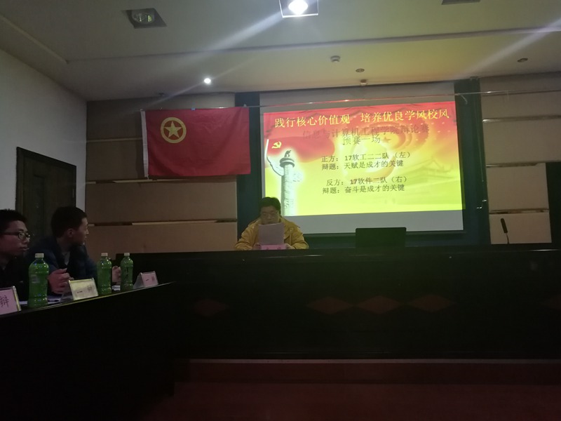 为践行社会主义核心价值观,培养萍乡学院优良学风校风,信息与计算机工程学院着手举办二级学院辩论赛。2018年3月18日晚19时30分,贺崧主持的信计学院辩论赛初赛正式开始。本次比赛由学院团总支学生分会主席叶云峰、副主席金咏琪、黄安、江国洲以及优秀辩手魏鹏、孙典、谢明君、袁玲担任评委,双方辩手所在的班级成员作为观众。
