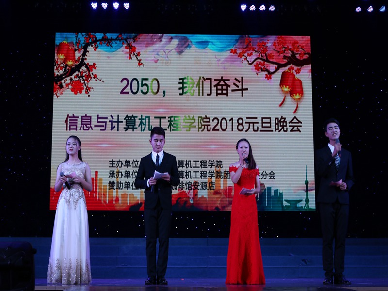 光阴荏苒,四季轮转,时光的车轮又缓缓的转过一圈。鸡鸣留胜迹,犬吠谱新歌,送走硕果累累的2017,我们总结,激情与奋斗,成功或失败都随时间的流逝成为了历史,2018,也将在我们憧憬、期待中,如约而至。为送别过去,也为再次启程,2017年12月16日晚19点,信息与计算机工程学院于萍乡学院音乐厅举办了以“2050,我们奋斗”为主题的元旦晚会,萍乡学院校党委委员、副校长刘卫林、校团委书记刘德平、信计学院党总支书记肖俊宇、院长周锦春、党总支副书记彭新平、办公室主任危远峰、辅导员肖咪咪、黎元钢老师、各班班主任和信计学院全体老师,学校各组织、各兄弟学院代表以及全体信计学子共同享受了这场青春的盛宴。