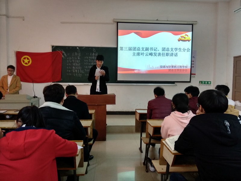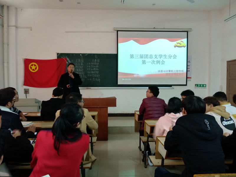 12月5日中午12点30分于鼎新楼2511召开了信息与计算机工程学院第三届团总支学生分会第一次例会。本次大会由丁要男主持,出席本次会议的有党总支副书记彭新平老师、第二届团总支学生分会主席丁要男以及各理事会成员,参加本次会议的有全体大一、大二学生会干事。经过12月1日第一次学生代表大会暨换届大会上激烈的竞选,最后,根据学生代表投票、平时表现以及老师意见确定了新一届理事会成员名单。