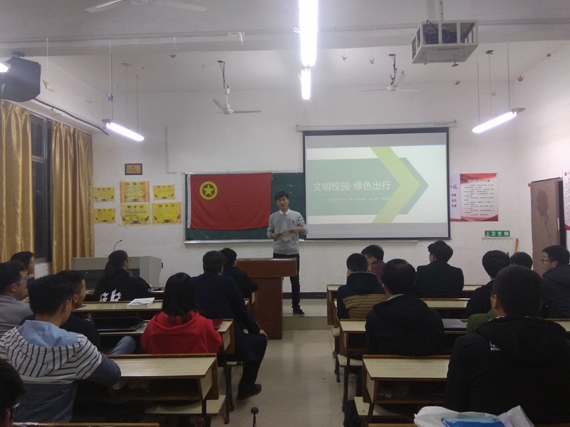 班会内容第一项:由叶云峰同学告知学校通知:禁止大学生在校园内骑行摩托车、电动车,自觉遵守学校管理规定,确保校园交通安全,让绿色环保、低碳出行的理念深入人心。