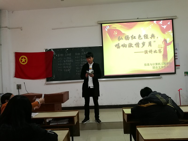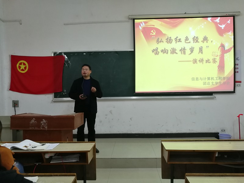 11月8日下午2:30,信计学院在鼎新楼四楼会议室举行“弘扬红色经典,唱响激情岁月”主题演讲比赛。此次演讲比赛由信计学院党总支副书记彭新平副教授、辅导员肖咪咪老师、黎元钢老师担任比赛评委。
