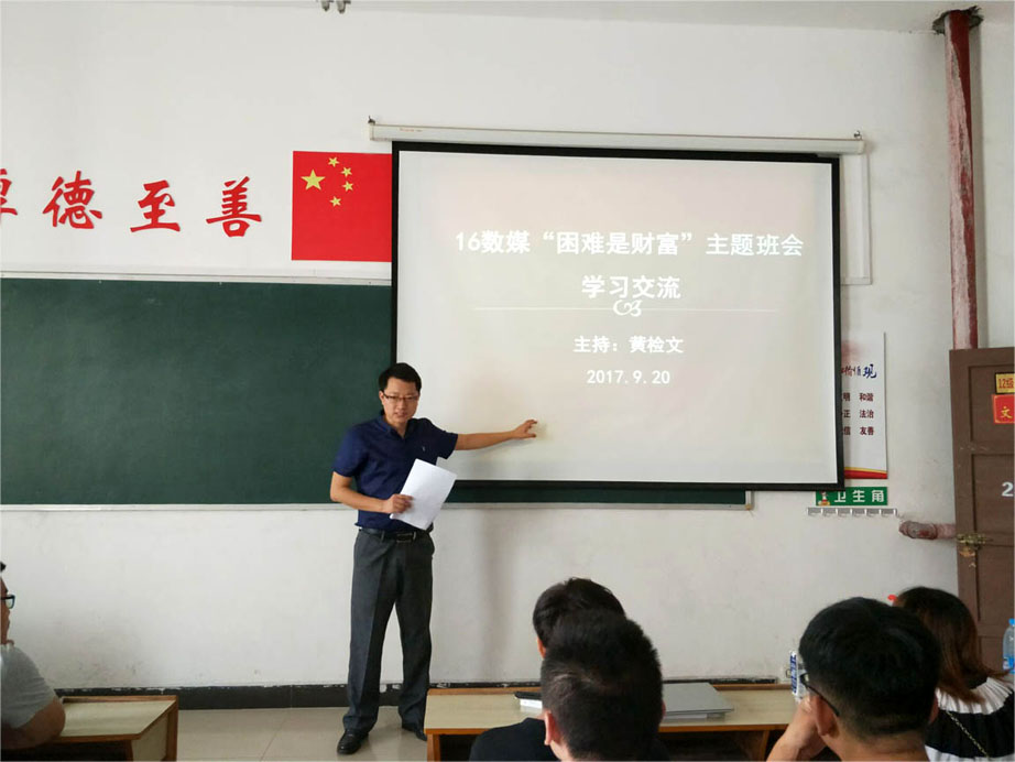 2017年9月20日上午,16数字媒体班级利用1、2节没有课的时间,在鼎新楼2507教室召开“困难是财富”主题班会交流活动。此次班会活动由班主任黄检文老师主持,全体同学参加。