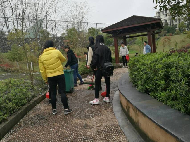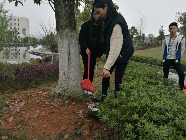 到达若水广场后,大家自行组队,详细分工,他们有的拿着扫帚,有的拿着垃圾斗,有的带着手套,有的拿着木棍,每个人都在认认真真勤勤恳恳地清理着;不管是地面上、草丛里、大树边,还是凉亭里、水池里、灌木丛里,小小的白色垃圾都逃不出他们的眼睛。他们弯下去的是腰,伫立起来的是雷锋精神!若水广场不算太大,但是卫生死角却很多,很多不起眼的地方都是布满垃圾的,但大家并没有觉得烦躁,反而是更加细致地清理。其间两个组织的成员没有觉得生分,反而是相互配合,相互合作,劳动气氛很好,大家在相互逗笑中工作着,看似枯燥乏味的卫生清理却生动有趣起来了。在预料之外的事情是,原本绿盈盈的草坪斜坡却被恶臭的水沟排水给淹了,布满了白色垃圾,空气里都弥漫着一股恶臭,大家都皱起了眉头,但是,大家并没有放弃,开始进行打扫,由于泥湿了,白色垃圾陷在泥里,扫把起不了多大用处,于是大家便就地取材,在树下寻找长木棍,使用长木棍去处理垃圾,即使那味道实是难闻恶心,大家也还是默默地清扫着,在费力清扫了大半个小时之后,那草坪才干净了些许,我们的力量有限,这部分的清扫实是困难,有关这部分位置的卫生问题我们会尽快报告给学校,让学校对此进行大力清扫,以便给大家带来一个良好的校园环境。