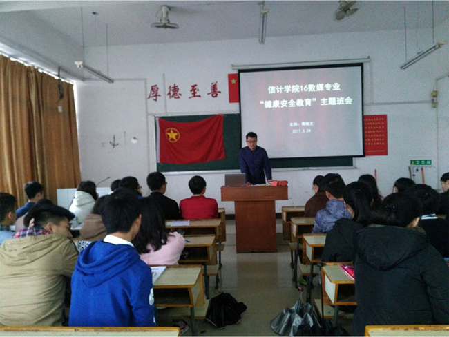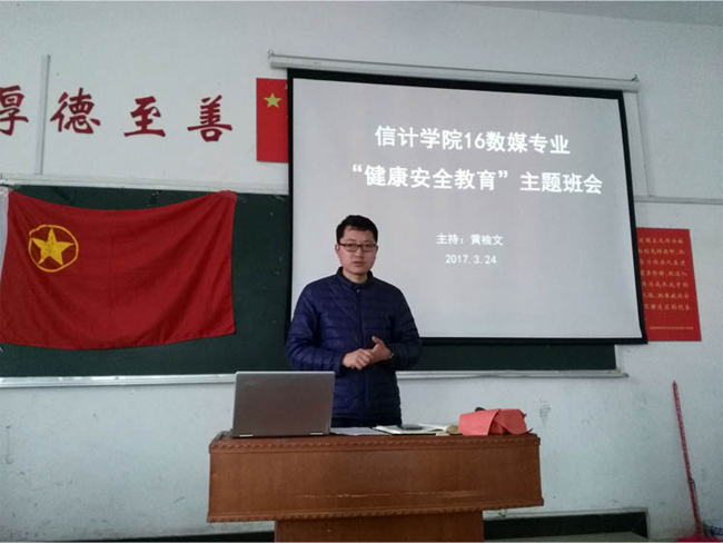 按照学校2017年07号文件《关于少数学生出现腹泻情况的应急处置工作方案》的通知要求和信计学院召开班主任学生安全工作会议的安排,16数媒班于2017年3月24日上午利用3、4节没有课程上课的时间,在鼎新楼2602教室召开“健康安全教育”主题班会活动,此次班会活动由班主任黄检文老师主持。