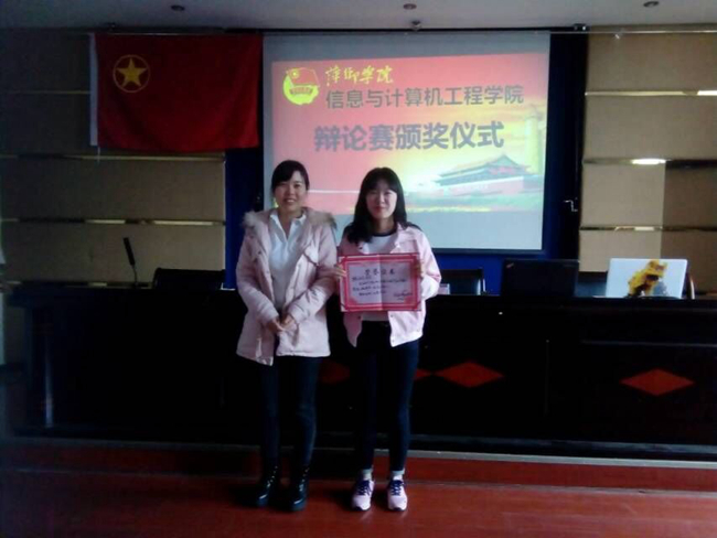 接下来肖咪咪老师为本届辩论赛优秀主持人杨淑贞同学颁奖,表示感谢与鼓励!