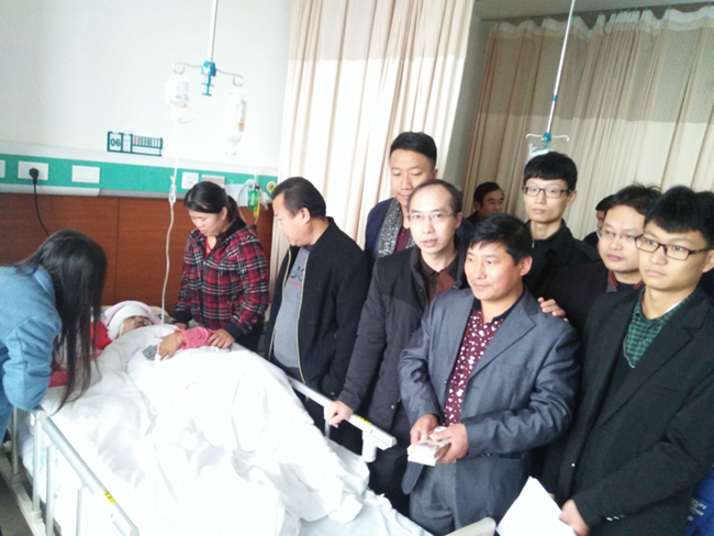 在慰问过程中,领导详细向贺金梅家长询问了贺金梅同学的病情,并鼓励她要坚定信念,保持乐观健康的心态,积极配合医生治疗,并亲切地告诉她,不要顾虑过多,安心养病,老师和同学都会尽力给予关怀和帮助。最后,肖俊宇书记将11月15日至18日募集到的21907.1元捐款转交给了她的家长并祝愿贺金梅同学早日康复。贺金梅家长接过捐款,并向前来探望的老师和同学表示感谢,感谢师生们及广大社会爱心人士对孩子的关心和帮助。