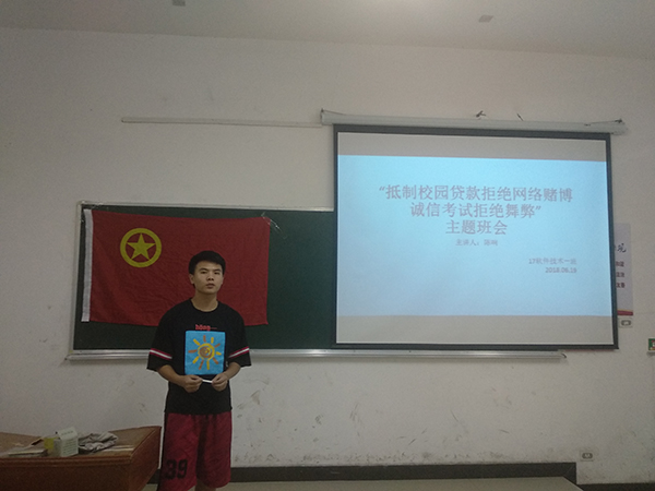 2018年6月19日19时40分,17软件技术一班在鼎新楼2511召开“抵制校园贷拒绝网络赌博,诚信考试拒绝舞弊”主题班会,此次班会由17软件技术一班班主任刘坚老师主持,17软件技术一班全体同学参加了此次主题班会。