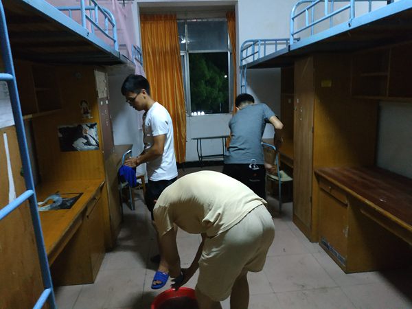 19点20分,女生在学生宿舍一栋楼下集合、男生在学生宿舍六栋楼下集合。随后,他们很快开始了分工打扫宿舍,擦床板、桌子以及扫地拖地,,每一处都打扫的非常仔细,全心全意为新生打造干净整洁的宿舍。