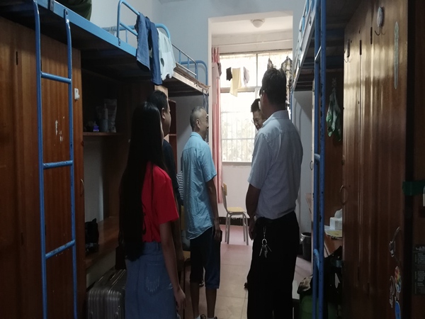 随后,一行人在2018级辅导员肖咪咪的带领下来到女生宿舍2栋。晚上天气很凉爽,辗转多个寝室,领导老师们没有忽略每一个新生宿舍,“是哪里人呢?”、“什么时候到的?”“坐了多久的车呢?家长陪同来的还是自己来的呢?”领导老师们一遍又一遍地亲切询问,新生们也大方地向老师们介绍自己,向老师们了解自己的专业,介绍自己的家乡等等。在了解到我院女生有住在7楼的,周院长表示希望她们能够克服高楼层困难,好好适应大学生活。彭老师在看望7楼的新生时幽默地说“住最高层可以每天爬楼梯锻炼锻炼身体。”现场交谈氛围热闹融洽。