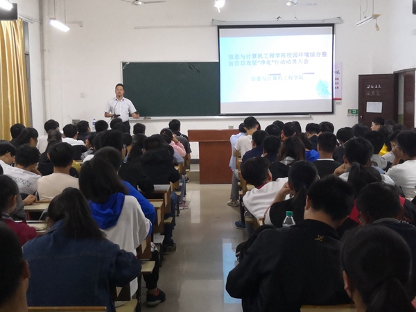 为积极响应学校百日“攻坚”净化行动号召,对校园环境进行综合整治。2018年10月29日晚7点整,信息与计算机工程学院在鼎新楼2511举行了校园环境综合整治百日“攻坚”净化行动动员大会。出席此次动员大会的有信息与计算机工程学院彭新平副教授,信息与计算机工程学院宿管委员会全体成员,全体寝室负责人,以及各班团支书和班长参加了此次大会。