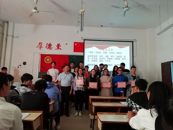 本次表彰大会分为两个环节,第一环节为表彰“诵读红色家书”活动获奖者、优秀朗诵者和最佳表演者,第二环节为彭新平副教授对“诵读红色家书”活动的总结发言。第一环节中,彭新平副教授为袁孟然、胡姗、田凤玲、丁梓祎四人颁发了一等奖,为廖金平、邱雨欣、李兴、陈芳婷四人颁发了优秀朗诵者奖,为宋琼、潘敏、钟兰、赵梦莹、周琦、王宇霞、涂传龙、廖福涛、吕智强、梁文杰、刘福银、盛磊、万立文一十三人颁发了最佳表演者奖。第二环节中,彭新平副教授表扬赞赏每一位积极参与“诵读红色家书”活动的同学,倡导激励同学们缅怀革命先驱,警醒自己、不忘初心,更好地肩负起一名大学生的时代梦想。彭新平副教授的讲话,让同学们热情澎湃,一片掌声喝彩中活动正式结束。