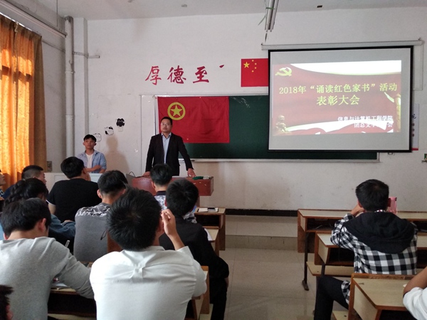 2018年11月1日中午十二点四十,信息与计算机工程学院在鼎新楼2419举办了“诵读红色家书”活动表彰大会。此次表彰大会由曾浩飞主持,并邀请信息与计算机工程学院彭新平副教授出席。