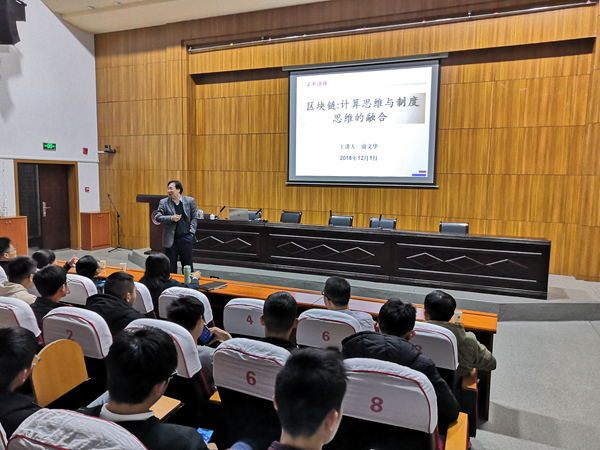 2018年12月1日19:00,由北京科技大学教授、中国农业大学农业经济管理学院管理学博士、北京大学城市与环境学院区域经济与城市土地政策方向的博士后俞文华教授带来的区块链专题知识讲座在萍乡学院至善楼学术报告厅成功举办。讲座由萍乡学院教务处副处长贺晓梅主持,信息与计算机工程学院领导老师出席了此次讲座,数百名信计学子踊跃参加。