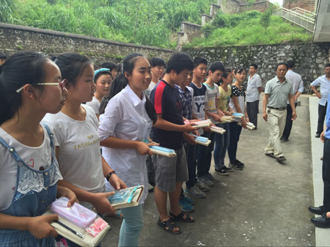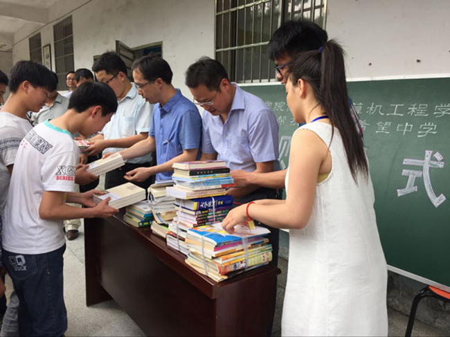抵达后,白竺中学刘校长向我们介绍了学校的历史及详细情况,该校有一定数量的贫困学生,其中有些是留守儿童,家庭负担沉重,学校资金不足,校图书馆所藏图书数量较少,孩子们读书的愿望一直无法得到满足。幸好有这么多社会爱心人士、企事业单位,为白竺中学捐书献爱心,完善学校图书资料,帮助同学们实现多读书的梦想,他非常开心看到这一切。同时,刘校长表达了对信息与计算机工程学院的感谢,他希望同学们努力学习长大后能把这种爱心传递下去。
