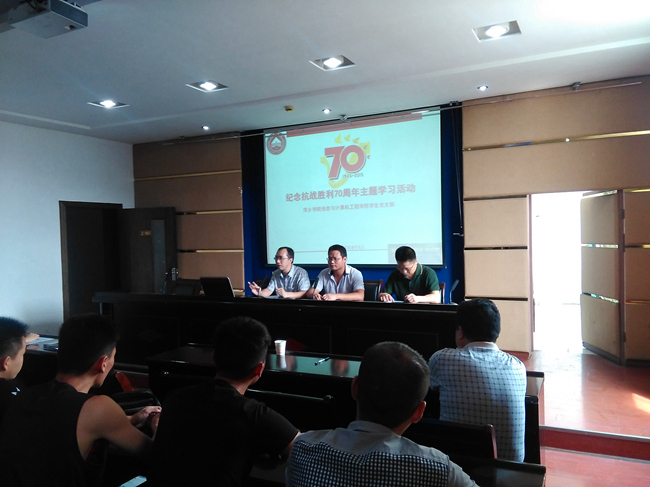 今年是中国人民抗日战争胜利和世界反法西斯战争胜利70周年,是人类正义战胜邪恶、光明战胜黑暗、进步战胜反动的纪念年,也是值得中华民族永远铭记的重要历史记录。为传承和弘扬爱国主义为核心的民族精神,进一步培育和践行社会主义核心价值观,信息与计算机工程学院根据学校部署安排开展了“纪念中国人民抗日战争暨世界反法西斯战争胜利70周年”系列主题教育活动,深切缅怀抗战英烈的光辉业绩,引导本院广大师生铭记历史、珍爱和平、珍惜幸福、开创未来。9月1日中午,我院全体学生干部、党建对象、学生党支部成员等在院党总支肖俊宇书记的主持带领下开展了《抗战胜利70周年》主题学习活动,参加学习活动的还有党总支副书记彭新平老师、副院长李希勇老师、团总支书记危远峰老师、学生党支部书记黄检文老师、辅导员肖咪咪老师等。