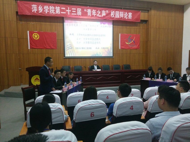 为锻炼学生的辩论能力和合作能力,提高同学们的思维反应速度、沟通技巧,增强学生语言组织能力和应变能力,5月17日晚,由校团委、思政部主办,校社联承办的第二十三届“青年之声”校园辩论赛半决赛在至善楼学术报告厅举行。莅临此次辩论赛的嘉宾评委有校团委书记刘德平,商学院教授文侃,体育学院副教授范春金,工会教师吴岚,学前教育学院团总支书记郑娟,文学院办公室主任黄娜,校青协会长刘亮,校团委学生副书记助理林宣,校社联副主席俞晓薇等,各参赛学院学生代表观看了本次比赛。