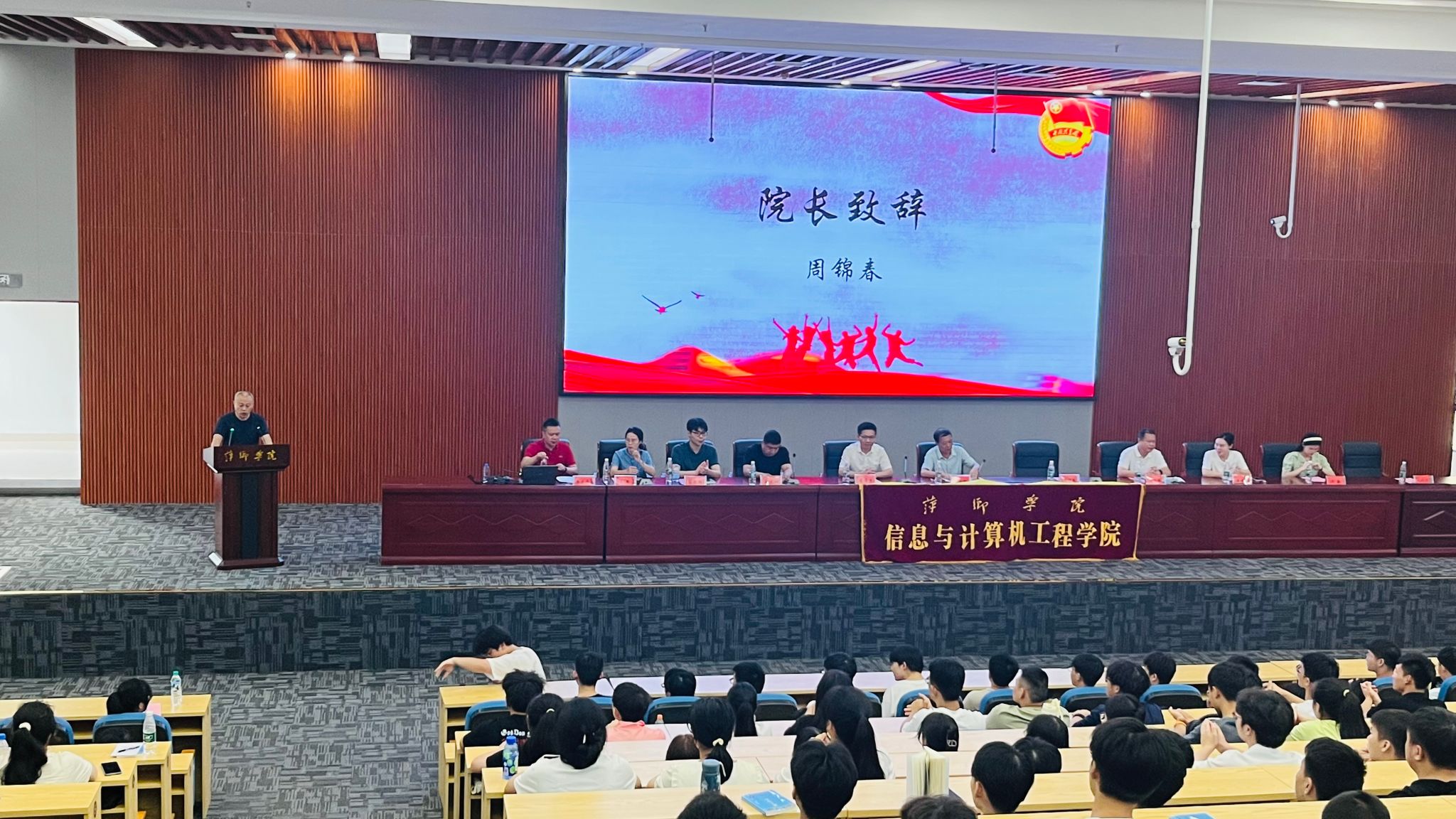 萍乡学院信息与计算机工程学院于2023年9月12日上午10:30在天泉楼学术报告厅举行了2023级新生见面会暨入学教育大会。会议由信息与计算机工程学院党委副书记李孟华主持,出席本次大会的领导老师有信息与计算机工程学院党委书记谭晏瑞、院长周锦春、党委副书记李孟华、副院长李希勇、学工科负责人危远峰和学工科辅导员王建芳、黎元钢、刘燕、仇树成、郭朝闻、唐敏。2023级全体新生参加了本次大会。