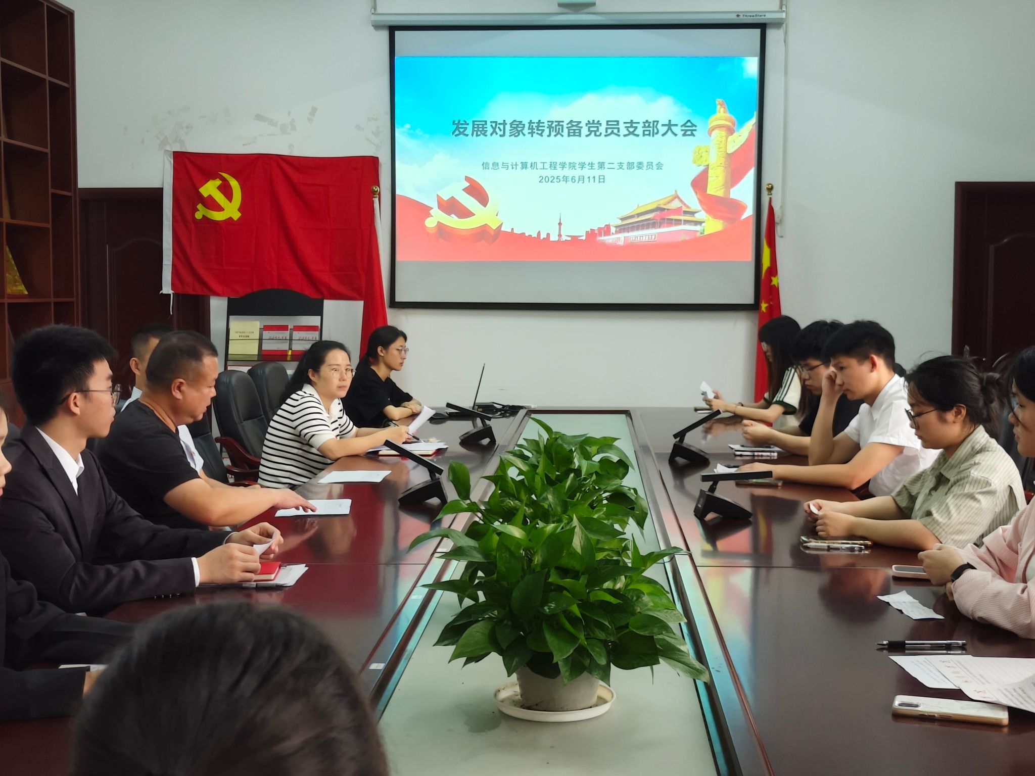 为深入推进党组织建设,进一步扩大组织规模,提升组织力量,推动党的事业蓬勃发展。2025年6月11日12:40,信息与计算机工程学院学生第二党支部于鼎新楼2401教室召开预备党员接收和预备党员转正大会。此次大会汇聚了信息与计算机工程学院学生第二党支部的全体党员、预备党员、发展对象及其培养联系人。大会由信息与计算机工程学院学生第二党支部书记刘燕同志主持。