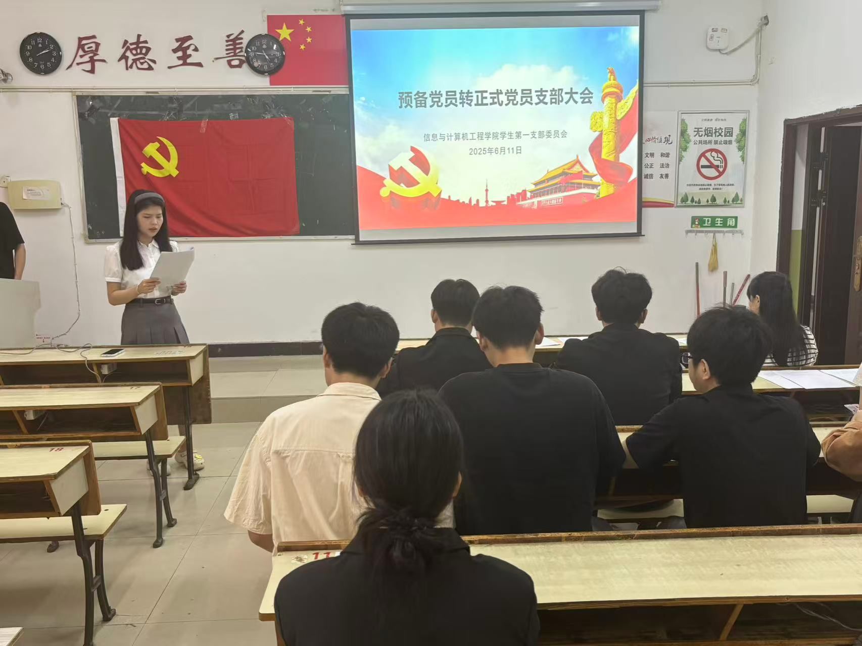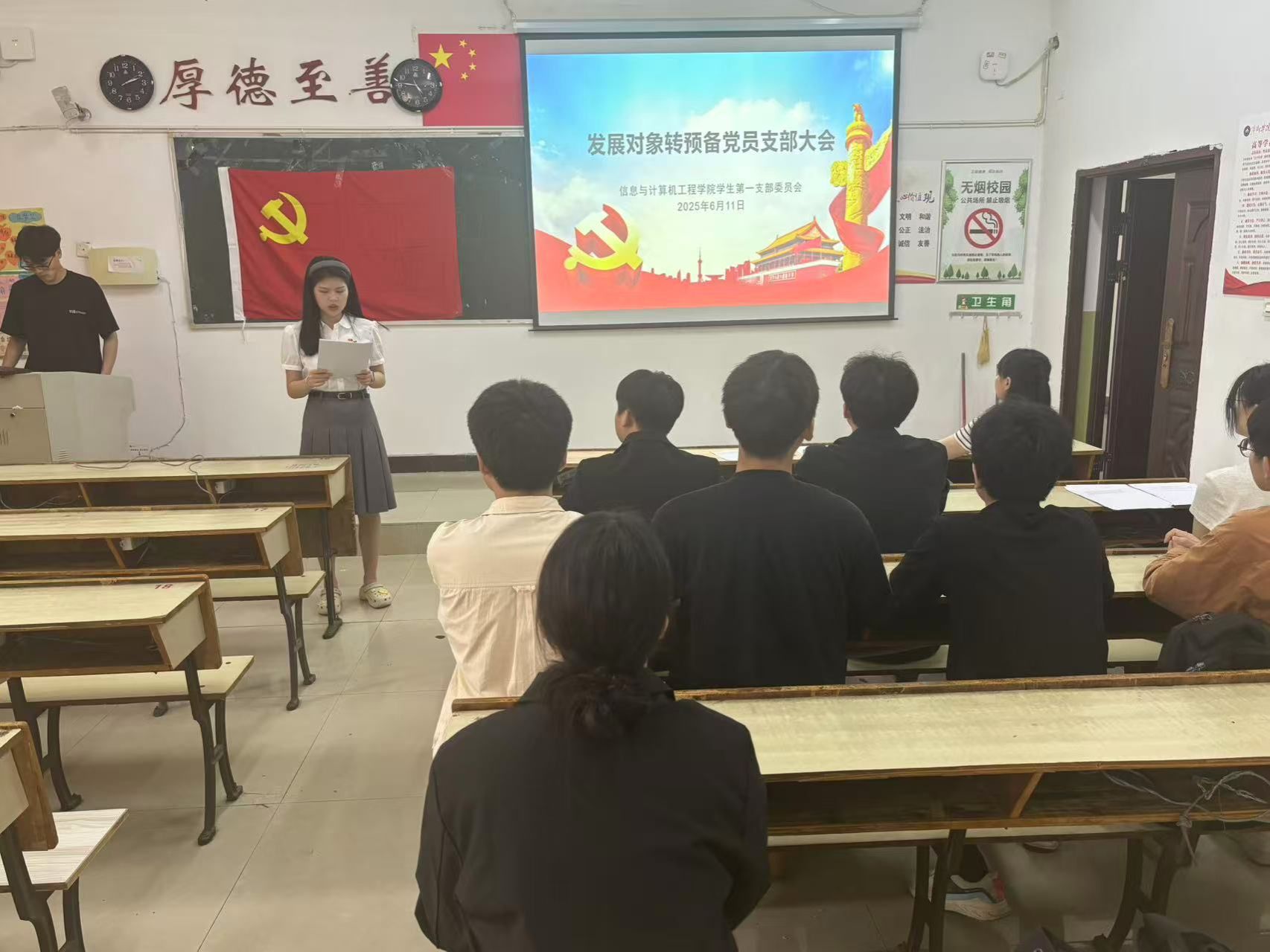 为进一步加强学生党组织建设,扩大组织规模,增强组织力量,并为党组织注入新的活力与生机。2025年6月11日12:40,信息与计算机工程学院学生第一党支部于鼎新楼2426教室召开预备党员接收和预备党员转正大会。参与此次大会的有信息与计算机工程学院学生第一党支部全体党员、预备党员、发展对象及其培养联系人。本次大会由信息与计算机工程学院学生第一党支部书记汤敏同志主持。