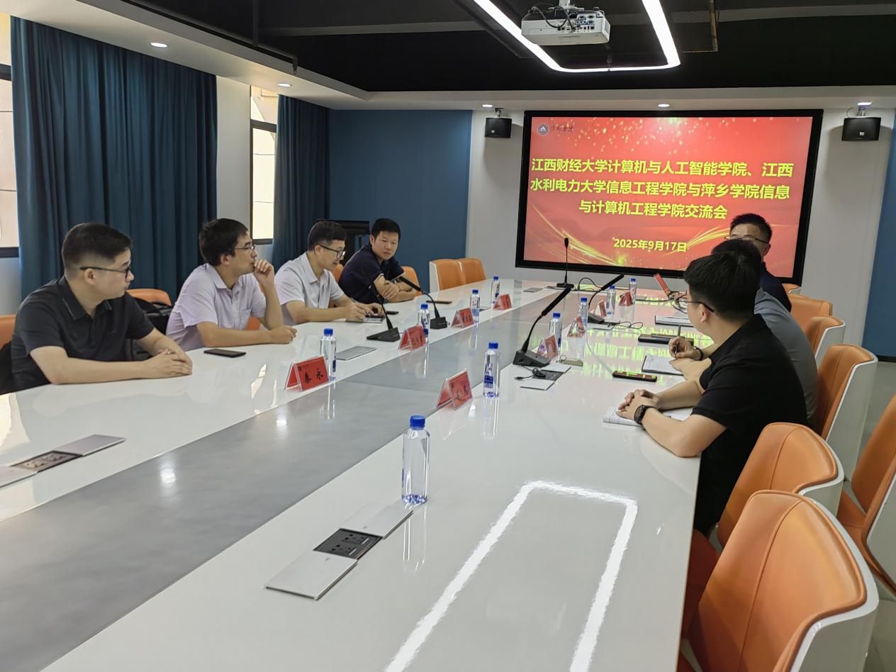 2025年9月17日,江西财经大学计算机与人工智能学院院长刘德喜、江西水利电力大学信息工程学院智慧水利江西省重点实验室专职副主任包学才一行到信息与计算机工程学院调研交流,江西财经大学计算机与人工智能学院党委副书记廖波、江西水利电力大学信息工程学院专业负责人秦永博士等随同调研。信息与计算机工程学院院长李希勇陪同调研并主持召开交流座谈会,副院长孙正广、办公室主任、教师代表参加交流会。
