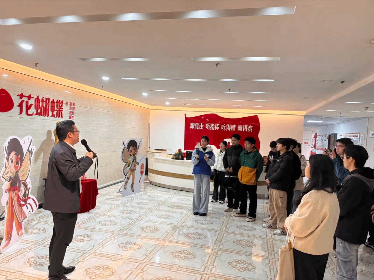 随后,师生前往江西花蝴蝶食品有限公司。在企业工作人员引导下,学生深入了解企业发展历程、“安心、用心、良心”的生产理念及“用良心做纯正食品,用诚心创百年品牌”的经营理念,感受企业从街头小摊到行业标杆的蜕变历程与独特企业文化,对食品行业的数字化发展与品牌建设有了全新认识。